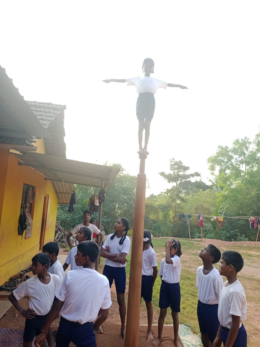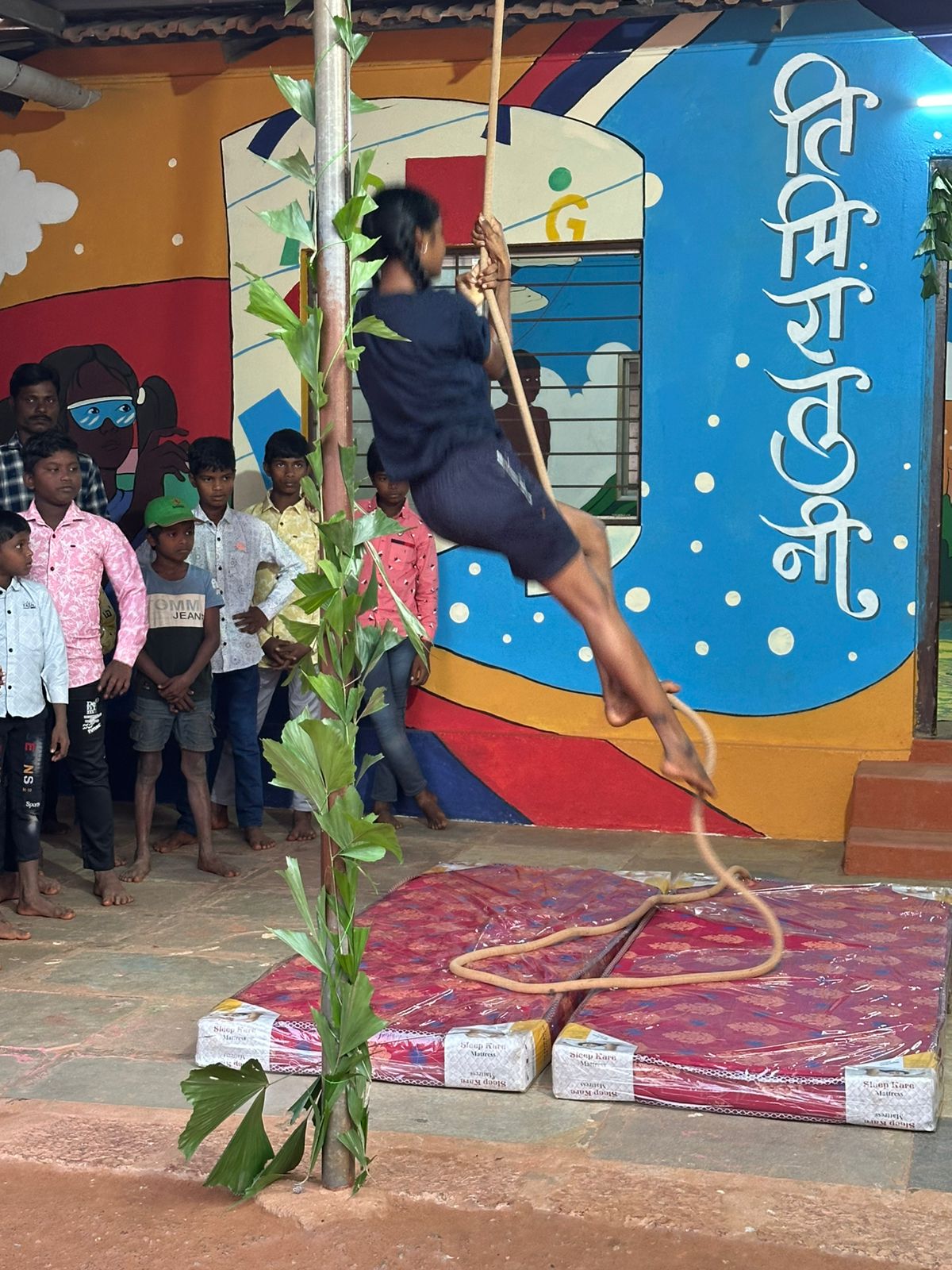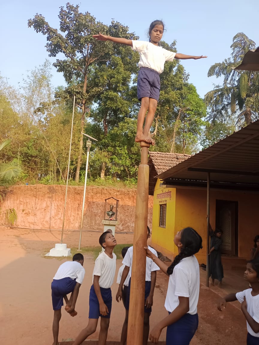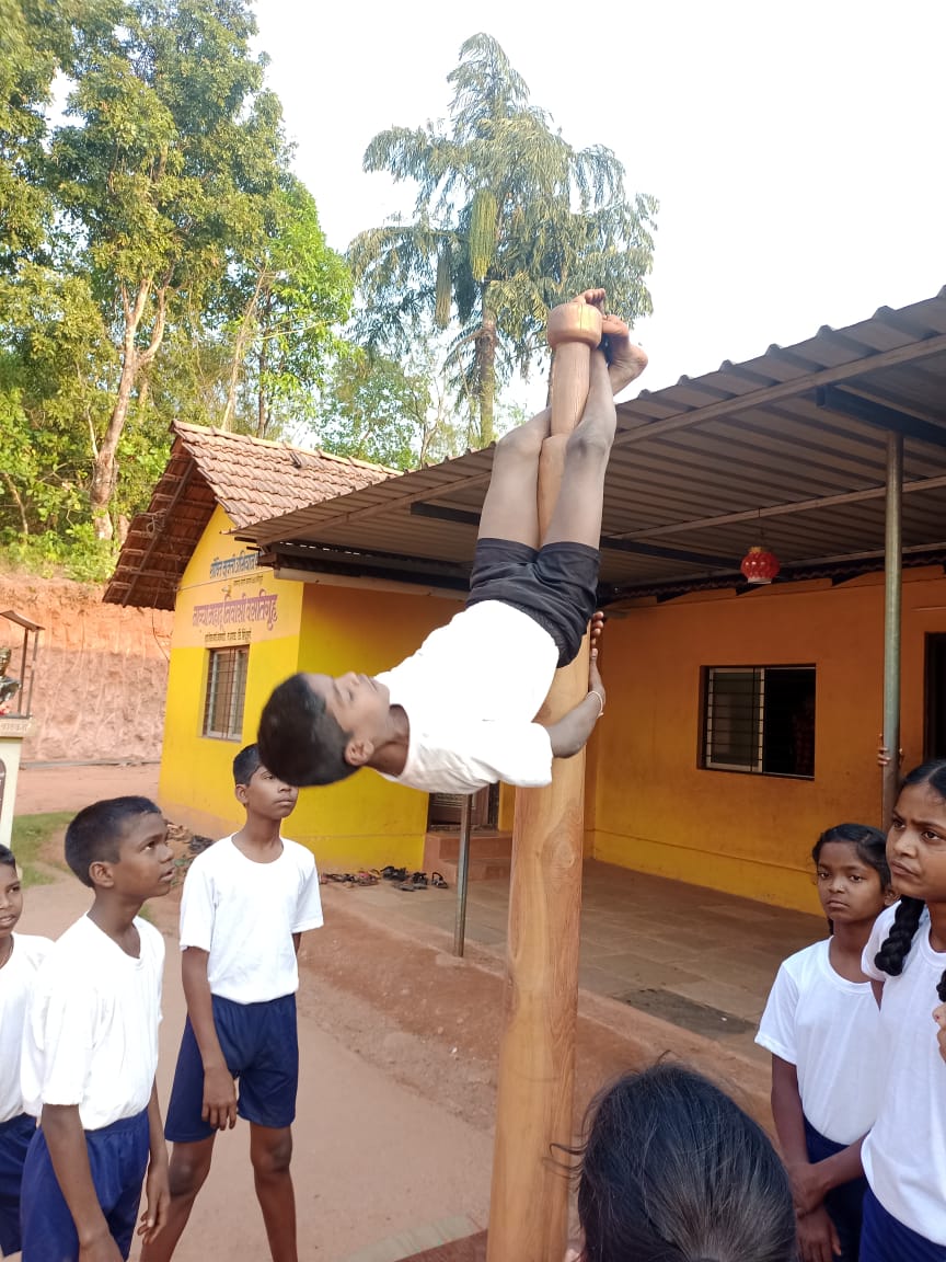 Vanita Pawar from Narur Adivasi pada at Vetalbambarde, Kudal, Sindhudurg district with Savali’s financial backing is training katkari boys and girls from Nagya Mahadu Vasahat to make experts at National level Mallakhamb champions.